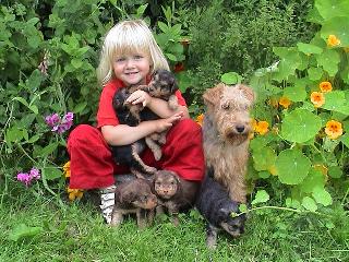 Male black and tan pups ready now. mother-very rare "liver and tan" which is a beautiful milk chocolate colour, this colour although still a terrier seems the softest, sweetest ones. Sire is the red dog Piano Man Van Foliny Home CC winner, his Sire is Champion Kingfisher Van Foliny Home.
