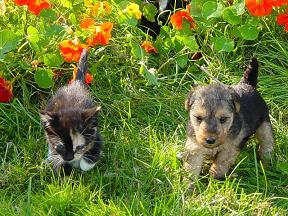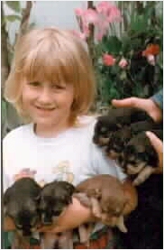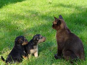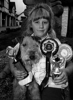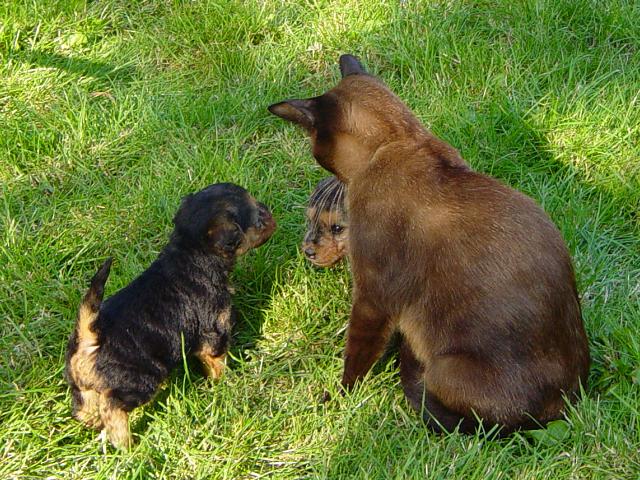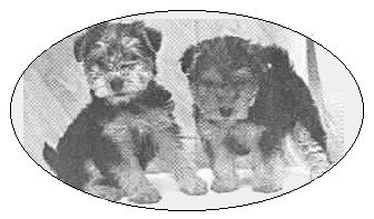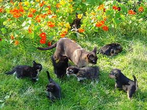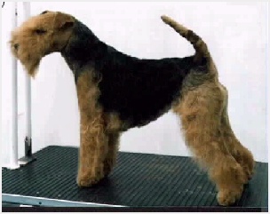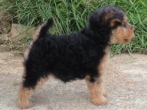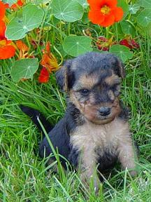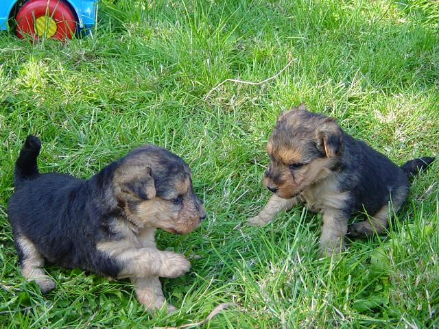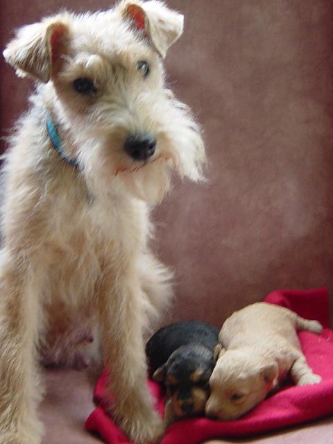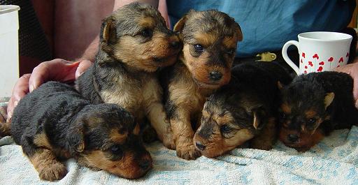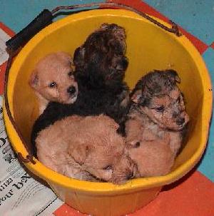 Six Kelda Lakeland terrier puppies at 7 days old. The lighter puppy's colouring is called "liver & tan", Lakelands of this colouring are fairly rare as